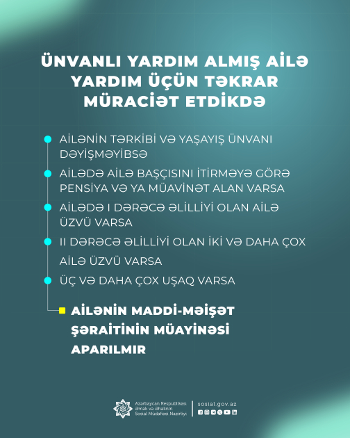 Ünvanlı yardım almış ailə yardım üçün təkrar müraciət etdikdə isə, əgər ailənin tərkibi və yaşayış ünvanı dəyişməyibsə, ailədə ailə başçısını itirməyə görə pensiya və ya müavinət alan varsa, ailədə I dərəcə əlilliyi olan ailə üzvü varsa, II dərəcə əlilliyi olan iki və daha çox ailə üzvü varsa, üç və daha çox uşaq varsa, ailənin maddi-məişət şəraitinin müayinəsi aparılmır.