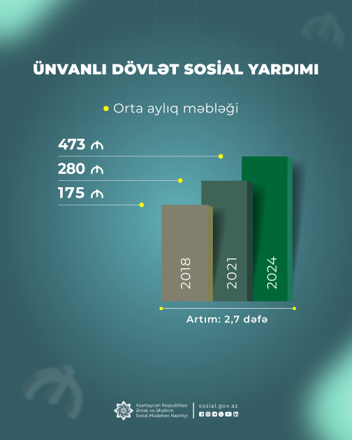 Hər ailəyə düşən ünvanlı yardımın orta aylıq məbləği 2018-ci ildəki 175 manatdan 2,7 dəfə artaraq 2024-cü ildə 473 manata çatıb.