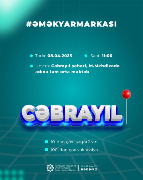 Cəbrayıl, Qubadlı, Zəngilan və Laçın rayonlarında Azərbaycan Respublikası Prezidentinin xüsusi nümayəndəliyinin dəstəyi ilə Əmək və Əhalinin Sosial Müdafiəsi Nazirliyinin tabeliyində Dövlət Məşğulluq Agentliyi Cəbrayıl və Laçın rayonlarında növbəti əmək yarmarkaları keçirəcək.