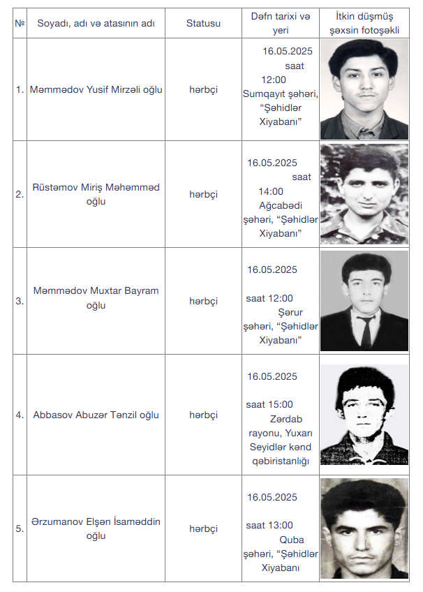 Əsir və itkin düşmüş, girov götürülmüş vətəndaşlarla əlaqədar Dövlət Komissiyasından verilən məlumata görə, mayın 16-da hərbçilər Yusif Mirzəli oğlu Məmmədov Sumqayıt şəhərindəki Şəhidlər xiyabanında, Miriş Məhəmməd oğlu Rüstəmov Ağcabədi şəhərindəki Şəhidlər xiyabanında, Muxtar Bayram oğlu Məmmədov Şərur şəhərindəki Şəhidlər xiyabanında, Abuzər Tənzil oğlu Abbasov Zərdab rayonunun Yuxarı Seyidlər kənd qəbiristanlığında, Elşən İsaməddin oğlu Ərzumanov Quba şəhərindəki Şəhidlər xiyabanında dəfn ediləcəklər.
