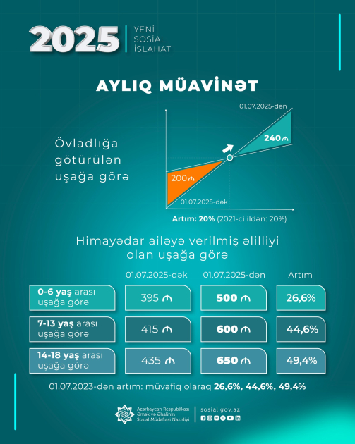 Qeyd edək ki, 2025-ci ilin yanvar ayından etibarən ölkəmizdə beşinci sosial islahat paketi çərçivəsində bir sıra sahələrdə sosial artımların icrasına start verilib. Dövlət başçısının imzaladığı “Əhalinin sosial rifahının yaxşılaşdırılması sahəsində tədbirlərin davam etdirilməsi haqqında” sərəncamına uyğun olaraq, minimum aylıq əməkhaqqının məbləği 16 faiz artırılaraq 345 manatdan 400 manata çatdırılıb. Vahid tarif cədvəlinə (VTC) əsasən, dövlət büdcəsindən maliyyələşdirilən sahələrdə (sosial, elm, səhiyyə, mədəniyyət, gənclər və idman, kənd təsərrüfatı, ekologiya və ətraf mühitin mühafizəsi, mənzil-kommunal, nəqliyyat və rabitə, meliorasiya, su təsərrüfatı və balıqartırma və s) çalışan işçilərin əməkhaqları artırılıb. Habelə minimum pensiyanın məbləği 280 manatdan 320 manata çatdırılıb, əmək pensiyalarının artımı təmin olunub. Ehtiyac meyarının məbləğinin 2025-ci il yanvarın 1-dən 285 manata çatdırılması sayəsində ünvanlı sosial yardım proqramı çərçivəsində vətəndaşların aldığı yardım məbləği də artırılıb.