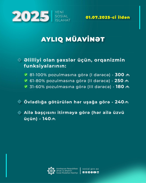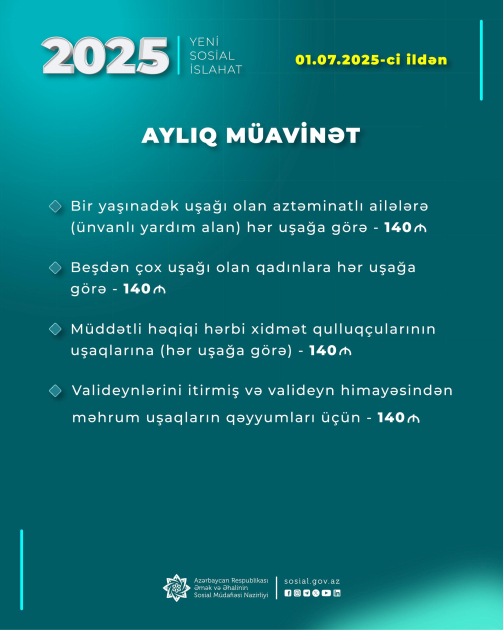 - Bir yaşınadək uşağı olan aztəminatlı ailələrə (ünvanlı yardım alan) hər uşağa görə aylıq müavinət - 140 manat;