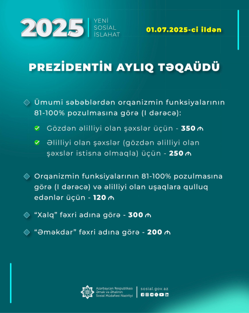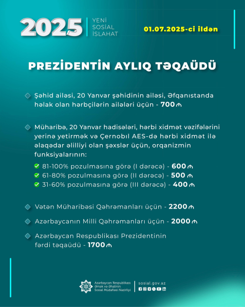 Prezident İlham Əliyevin Fərmanına əsasən, növbəti, 2018-ci ildən ötən dövrdə isə 5-ci sosial islahat paketi çərçivəsində bu gündən - iyulun 1-dən müavinət və təqaüdlər artırılıb.