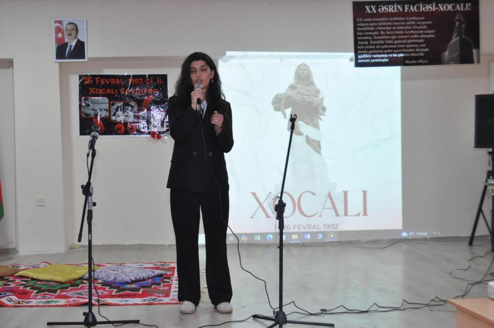 Daha sonra məktəbin tarix müəllimi Aqiyə Zaidova çıxış edərək faciənin tarixi mahiyyətini faktlar əsasında izah edib və Xocalı həqiqətlərinin daha geniş yayılmasının əhəmiyyətini vurğulayıb.