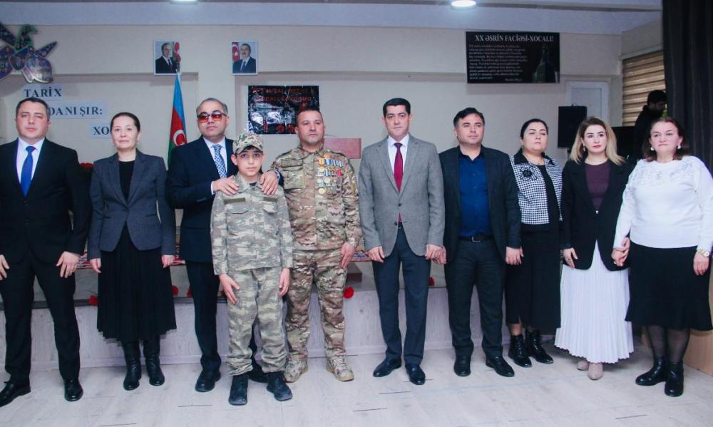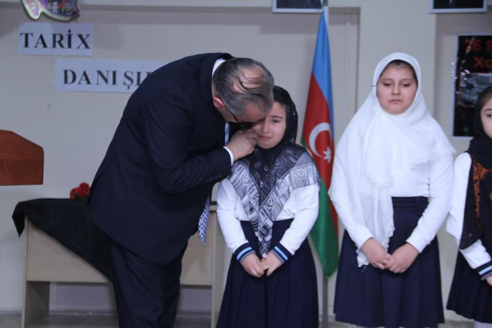 Tədbirdə məktəbin direktoru Nəriman Mürsəliyev 34 il əvvəl erməni separatçıları tərəfindən törədilmiş Xocalı soyqırımı barədə məlumat verərək, bu faciənin qisasının artıq alındığını qeyd edib.