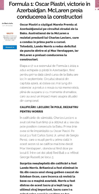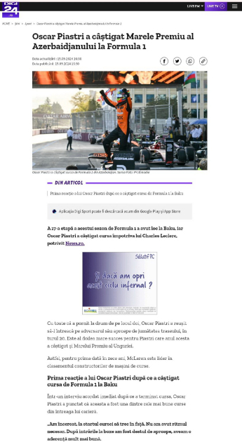 AZƏRTAC-ın məlumatına görə, “GSP”, “G4media”, “Pitstop”, AGERPRES xəbər agentlikləri paytaxtımızın 2016-cı ildən Formula 1 yarışlarına ev sahibliyi etdiyini və pilotların Bakı Şəhər Halqasında iki saat ərzində 51 dövrə vurduğunu yazıb. Bildirilib ki, “McLaren” komandasının avstraliyalı pilotu Oskar Piastri bu yarışda birinci yeri tutub, Şarl Lekler (“Ferrari”) ikinci, Corc Rassell (“Mercedes”) isə üçüncü olub.