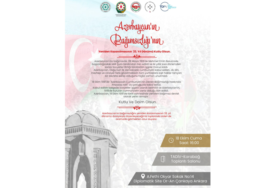 Ankarada Azərbaycanın Müstəqilliyinin Bərpası Günü qeyd olunacaq
