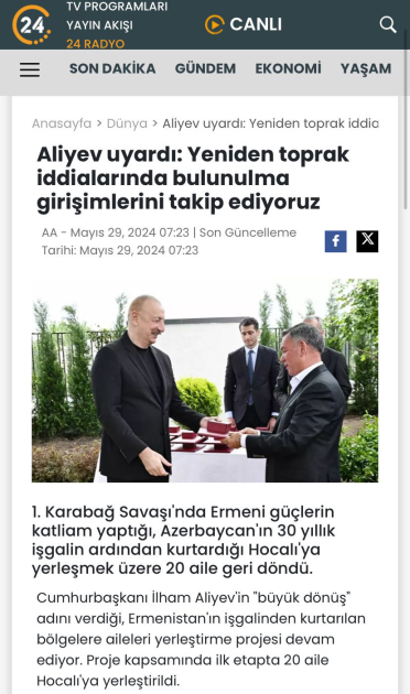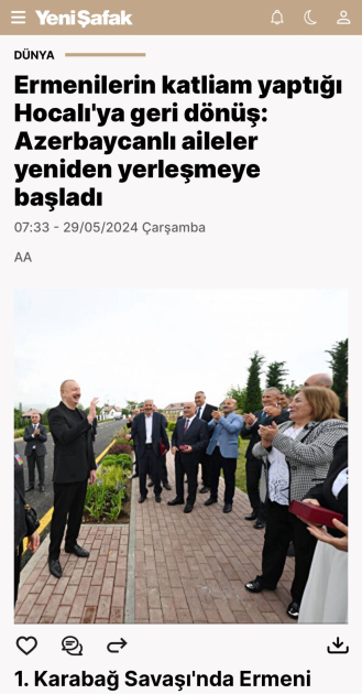 “Əliyev Xocalıya səfər etdi!”, “Azərbaycan bir daha belə acı yaşamayacaq”, “Ermənilərin soyqırımı törətdiyi Xocalıya azərbaycanlı ailələrin köçürülməsinə başlanıldı”, “Azərbaycan Prezidenti Xocalıda Ermənistana səsləndi”, “Əliyev xəbərdarlıq etdi: Ərazi iddiaları ilə bağlı yeni cəhdləri izləyirik”, “İşğaldan azad edilən Xocalıda yeni dövr: Azərbaycan ailələri qayıdırlar” və digər sərlövhələrlə yayımlanan xəbərlərdə Prezident İlham Əliyevin Müstəqillik Gününü işğaldan azad edilən ərazilərdə, bu bölgələrə qayıdan keçmiş məcburi köçkünlərlə birlikdə qeyd etdiyi vurğulanır.