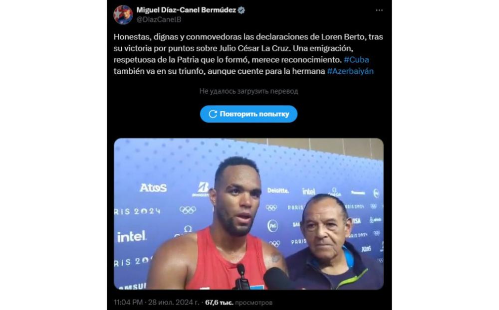 Kuba Prezidenti Migel Dias-Kanel Bermudes Azərbaycan boksçusu Alfonso Dominqesin “Paris-2024” Yay Olimpiya Oyunlarında ilk qələbəsindən sonra verdiyi müsahibəyə münasibət bildirib.