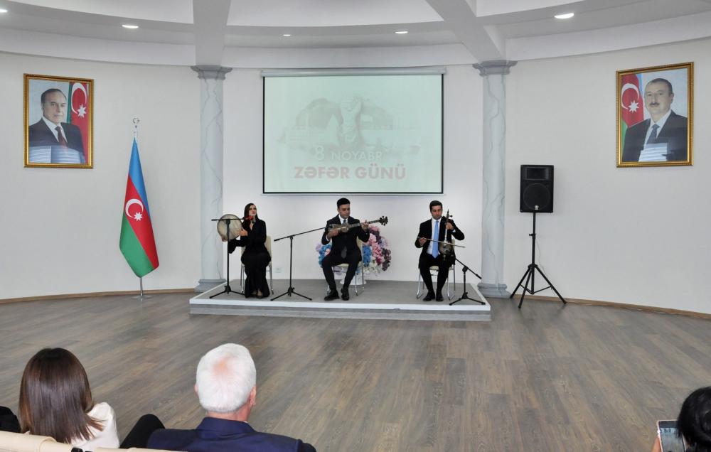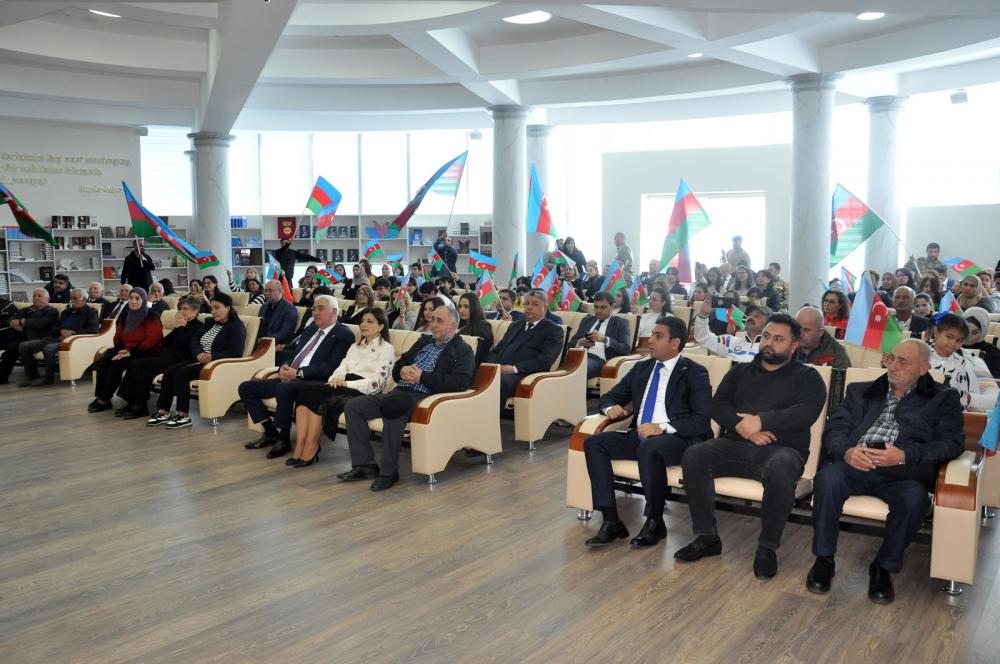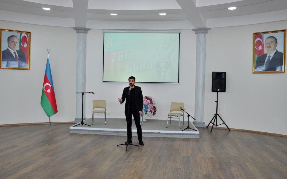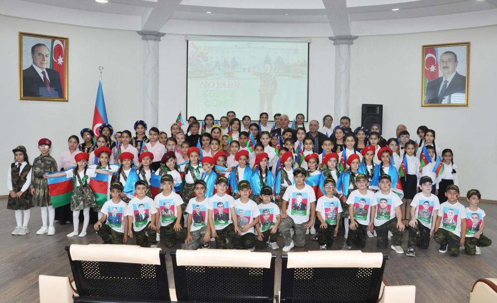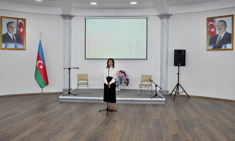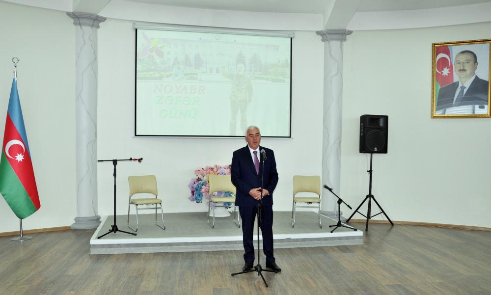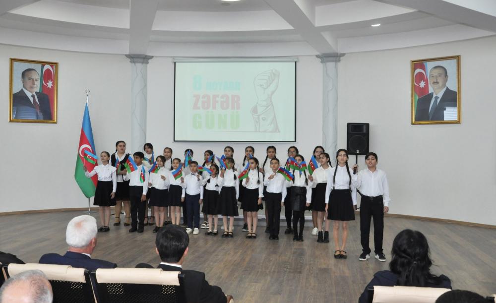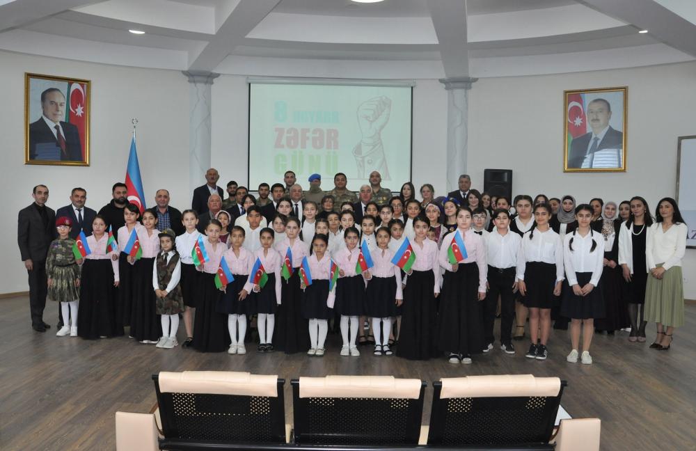 Daha sonra ümumrayon tədbirinin rəsmi hissəsi başlamışdır. Dövlət himninin səsləndirilməsi və şəhidlərimizin əziz xatirəsinin bir dəqiqəlik sükutla yad olunması ilə başlayan mərasimdə RİH başçısı Vasif İmanov və millət vəkili Günay Əfəndiyeva çıxış edərək bildirmişlər ki, Azərbaycan xalqının şanlı Qələbəsi, 44 günlük Vətən müharibəsində əldə olunan zəfər, yalnız hərbi gücün və qətiyyətin deyil, həm də milli birliyin, əzmkarlığın və Vətənə sonsuz sevginin təntənəsidir. Bu zəfər xalqımızın müstəqillik uğrunda apardığı mübarizənin ən yüksək zirvəsidir və hər bir azərbaycanlı bu böyük qələbəni qürurla qeyd edir. Noyabrın 8-i tariximizdə əbədi olaraq qalacaq, çünki bu gün biz Azərbaycanın müstəqil və suveren dövlət olaraq qürurlu gələcəyinə əmin addımlayırıq. Prezident İlham Əliyevin rəhbərliyi ilə qazanılan bu zəfər, həm də ərazi bütövlüyümüzün bərpası, milli ləyaqətimizin və gücümüzün nümayişidir. Bu müharibə göstərdi ki, Azərbaycan xalqı hər zaman öz torpaqlarını müdafiə etməyə, azadlığa sahib çıxmağa hazırdır. Həmçinin, vurğulanmışdır ki, bu zəfər şəhidlərimizin və qazilərimizin verdiyi müqəddəs savşla, qanla - canla qazanılmışdır.