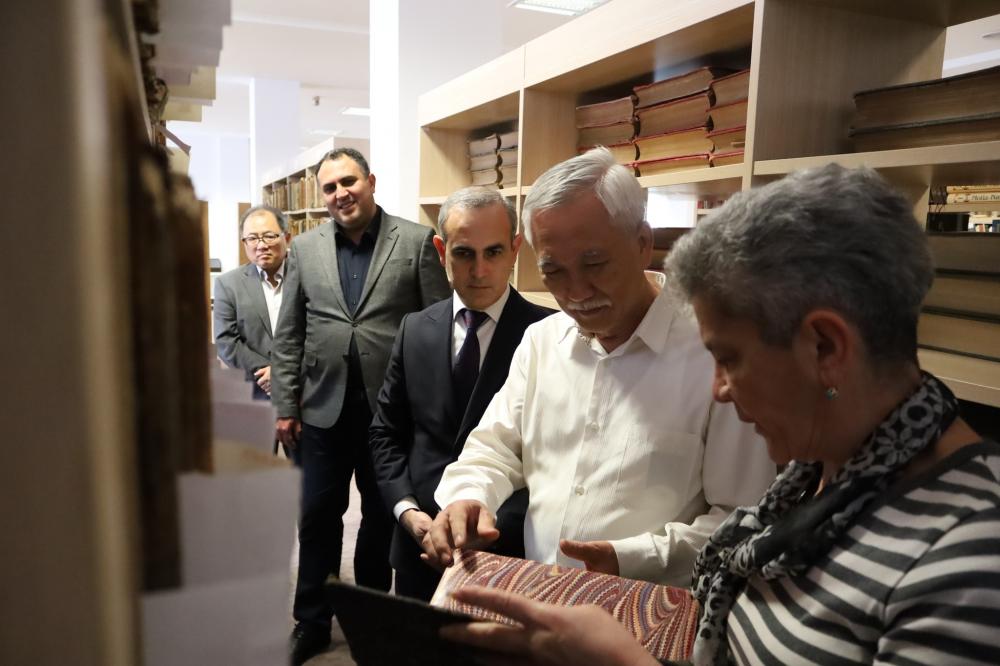 Daha sonra qonaqlar kitabxananın iş prosesi və fondları ilə yaxından tanış olublar. MEK-in Qarabağ müharibəsi qəhrəmanları, Nadir kitablar, Diplomatik fondları, oxu zalları ziyarət edilib. 44 günlük Vətən müharibəsindən sonra dövlətin dəstəyi ilə Azərbaycan kitabxana sistemində ilk dəfə MEK-də yaradılan Qarabağ müharibəsi qəhrəmanları fondunun əsas məqsədləri, fəaliyyəti və burada mövcud olan nəşrlər, guşələr haqqında ətraflı məlumat alıblar. Bundan əlavə, qonaqlar Respublikada XVI əsrə aid ən qədim kitab, nadir və qiymətli nəşrlər, həmçinin diplomatik nümayəndəliklər tərəfindən MEK-ə hədiyyə edilən ədəbiyyatlarla tanış olublar. Görüş zamanı qonaqlar MEK-də Sinqapur guşəsinin də yaradılmasını təklif ediblər.
