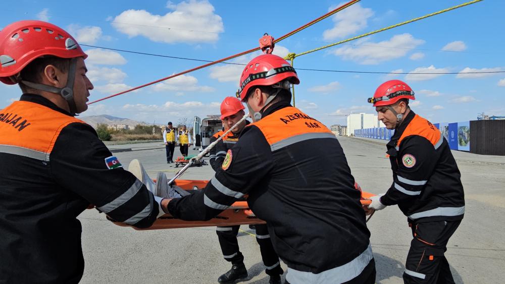 Sonra təlimin praktiki hissəsinə start verilib. Belə ki, şərti yanğın zamanı “Həyəcan” siqnalı verildikdən sonra FHN-in yanğın-xilasetmə bölmələri operativ qaydada hadisə yerinə çataraq kompleksin müvafiq personalı ilə əlaqəli şəkildə obyektin təxliyə planına uyğun insanların təhlükəsiz yerə təxliyəsini həyata keçirib, paralel olaraq “yanğınla mübarizə” tədbirləri yerinə yetirilib və şərti xəsarət almış şəxslərə “ilkin yardım göstərilib”.
