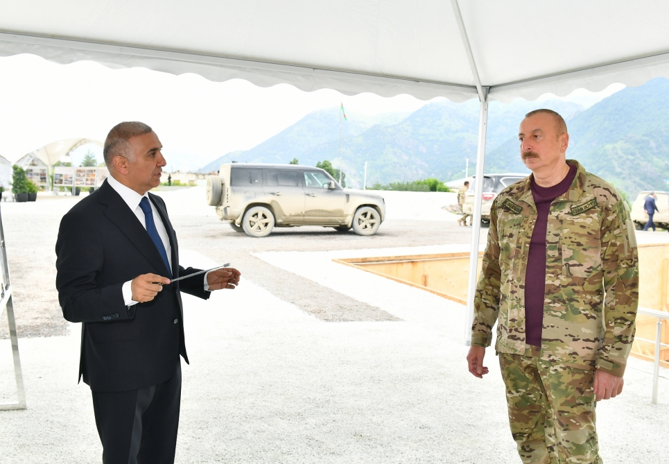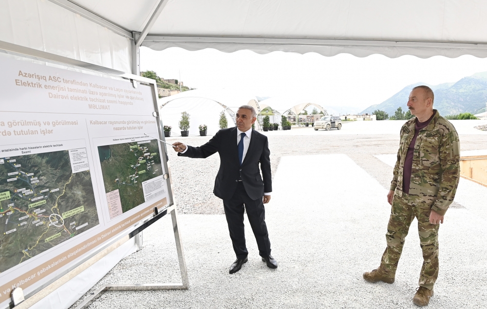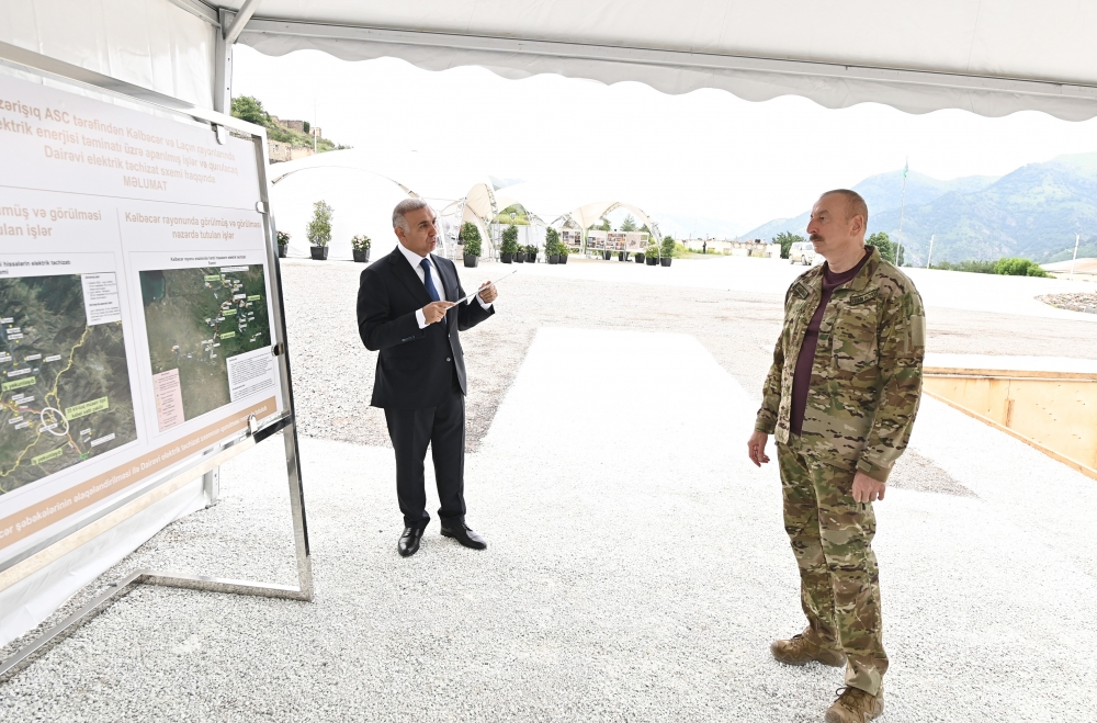 Глава государства был проинформирован о том, что широкомасштабная работа по обеспечению электроэнергией объектов особого государственного значения и воинских частей на территории Кяльбаджарского района продолжается и сегодня. В рамках работ из расположенной в городе Гянджа подстанции «Гянджа-2» в качестве источника в Дашкесан проложена 110-киловольтная линия электропередачи. Это высоковольтная линия сыграет исключительную роль в обеспечении Кяльбаджара бесперебойной и качественной электроэнергией. Она проходит через территорию с самым сложным рельефом в Азербайджане. Для свободного передвижения техники в горах вначале была проложена дорога.