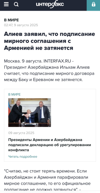 Məqalədə deyilir: “Ermənistan və Azərbaycan liderləri Nikol Paşinyan və İlham Əliyev 40 ildir davam edən qanlı Qarabağ münaqişəsindən sonra cümə günü ABŞ Prezidenti Donald Trampın iştirakı ilə Vaşinqtonda sülh sazişi imzalayıblar. “Biz bu gün Cənubi Qafqazda sülh bərqərar edirik”, - deyən Azərbaycan Prezidenti İlham Əliyev vurğulayıb ki, “bu gün biz böyük bir yeni tarix yazırıq”. Ermənistanın Baş naziri Paşinyan əlavə edib ki, bu razılaşma “sülh fəslinin açılmasını” təmsil edir. Tramp isə bildirib: “Ermənistan və Azərbaycan bütün döyüşləri əbədi olaraq bitirmək öhdəliyi götürür”.