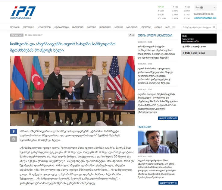 Gürcüstanın nüfuzlu media orqanları “imedinews.ge, “interpressnews.ge”, “resonancedaily.com”, “aktual.ge”, “for.ge”, “netgazeti.ge”, “tabula.ge”, “info9.ge”, “news.ge”, “newposts.ge”, “interpress.ge”, “24news.ge”, “qafqazturk.com” informasiya portalları, “1tv.ge” televiziya kanalı avqustun 9-da silsilə materiallar yayıblar. Qonşu ölkənin mediası Donald Trampın görüşdən və imzalanma mərasimindən sonra səsləndirdiyi fikirlərə də xüsusi yer ayırıb.