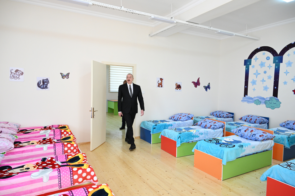 Dövlətimizin başçısına məlumat verildi ki, müasir standartlara uyğun inşa edilmiş 120 yerlik körpələr evi-uşaq bağçasında azyaşlıların təlim-tərbiyəsi ilə məşğul olmaq, onların sağlam mənəvi və fiziki mühitdə yetişmələri üçün hər cür şərait var. Otaqların hamısı zəruri avadanlıqla təchiz olunub. Körpələr evi-uşaq bağçasında 6 qrup fəaliyyət göstərəcək.