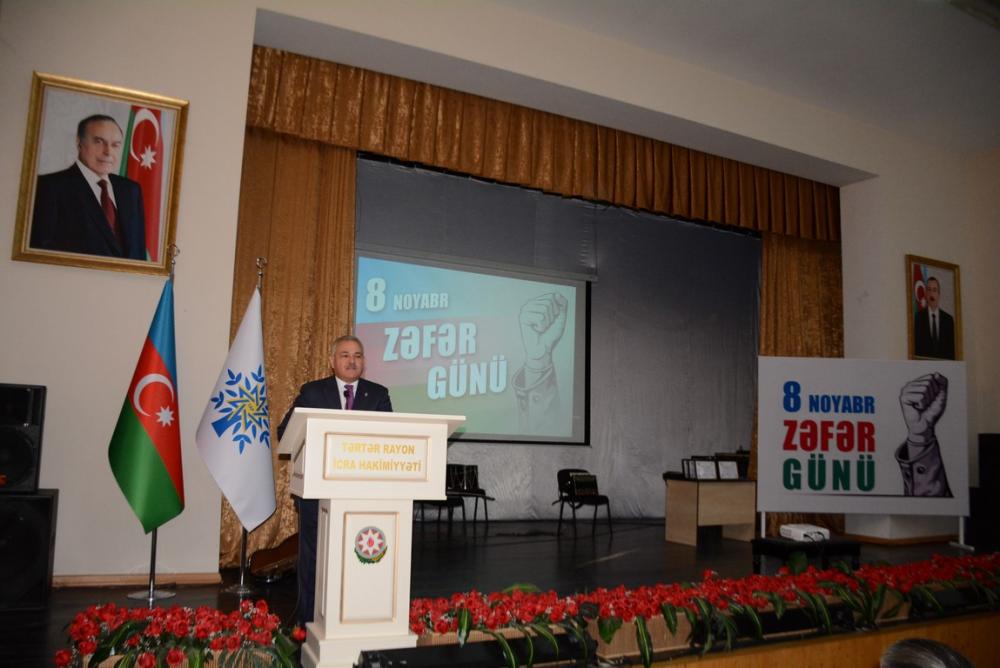 Tədbirdə rayon icra hakimiyyətinin başçısı Müstəqim Məmmədov çıxış edərək, tərtərlilərin şəxsində bütün Azərbaycan xalqını 8 noyabr –Zəfər Günü, möhtəşəm və qürurverici bayram münasibəti ilə təbrik edib və 44 günlük müharibədə əldə edilən Qələbənin sevincindən danışıb. Bildirib ki, artıq 5 ildir Azərbaycan xalqı onun üçün mədəniyyət, milli irs və qürur mənbəyi olan Şuşanın işğaldan azad edildiyi tarixi – 8 Noyabrı Zəfər Günü kimi qeyd edir. Qeyd olunub ki, bu qələbə sevincini tərtərlilər böyük qürurla yaşayıblar. Çünki onlar 30 il düşmənə gözdağı olublar. Düşmənlə üz-üzə, göz-gözə yaşayıb, işləyən tərtərlilər düşmənə bir qarış da torpaq verməyiblər. 44 günlük Vətən müharibəsində uşaqlı–böyüklü bütün tərtərlilər dözüm, dəyanət nümayiş etdiriblər. Ön cəbhədə olduğu kimi arxa cəbhədə də mülki insanlar şəhid oldu, yaşayış məntəqələrimiz atəşə tutuldu, ancaq düşmənə bir qarış da torpaq verilmədi. Vətən müharibəsində Ermənistan silahlı birləşmələri beynəlxalq hüquq normaları ilə müəyyən olunmuş qaydaları pozaraq, Tərtər şəhəri də daxil olmaqla rayonun yaşayış məntəqələrinə 16 min 277 top, tank, qrad mərmisi, 21 qadağan olunmuş raket atıb, bəzi günlərdə Tərtərə 2000-dən çox mərmi atılıb.