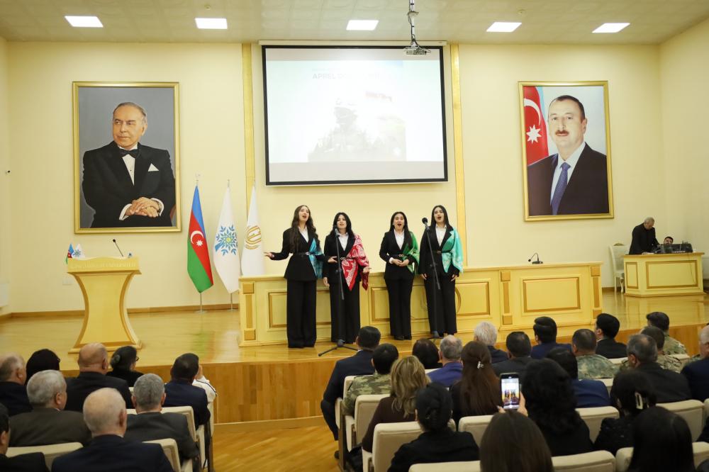 Gəncə Dövlət Universitetinin rektoru Yusif Yusibov çıxış edərək, bildirib ki, Aprel döyüşlərinin tarixi ədalətin, zəfərin başlanğıcı oldu: “Aprel qələbəsi xalqımızın Prezident cənab İlham Əliyevin ətrafında sıx birləşdiyini, igid əsgərlərimizin Ali Baş Komandanın əmri ilə işğal olunmuş torpaqların azad olunmasına tam hazır olduğunu sübut etdi”.