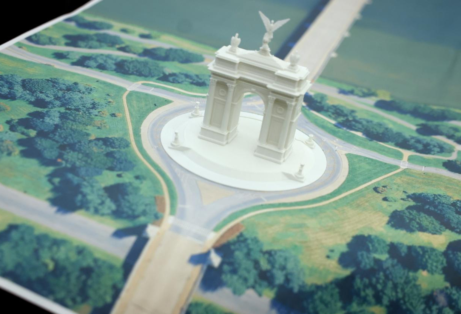 Paylaşımda əlavə edilən fotoşəkildə Harrison Design tərəfindən hazırlanmış layihə əks olunub. Dizaynda qızılı elementlərlə bəzədilmiş açıq rəngli daş tağ, yuxarı hissəsində iki böyük metal qartal və “Azadlıq” heykəlini xatırladan qızılı fiqur təsvir edilib.