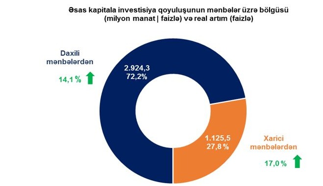 2026-cı ilin yanvar-mart aylarında əsas kapitala 4 milyard 049,8 milyon manat məbləğində və ya ötən ilin eyni dövrü ilə müqayisədə real ifadədə 14,9 faiz çox investisiya yönəldilib. Neft-qaz sektoruna yönəldilmiş investisiyaların həcmi real ifadədə 44,6 faiz artaraq 1 milyard 525,9 milyon manat, qeyri neft-qaz sektoruna yönəldilmiş investisiyaların həcmi isə real ifadədə 2,2 faiz artaraq 2 milyard 523,9 milyon manat olub. Əsas kapitala yönəldilmiş investisiyaların həcmi məhsul istehsalı sahələri üzrə real ifadədə 23,9 faiz artaraq 2286,6 milyon manat, xidmət sahələri üzrə real ifadədə 27,3 faiz artaraq 1252,8 milyon manat, yaşayış evlərinin tikintisinə yönəldilmiş investisiyaların həcmi isə real ifadədə 26,6 faiz azalaraq 510,4 milyon manat təşkil edib.
