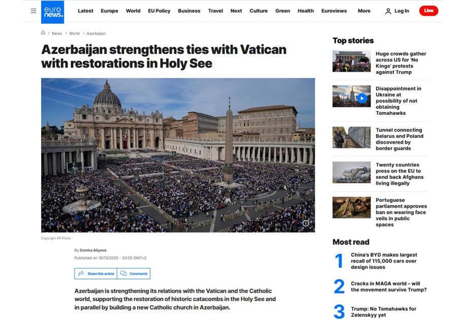 “Euronews”: Azərbaycan Müqəddəs Taxt-Tacla əlaqələri gücləndirir