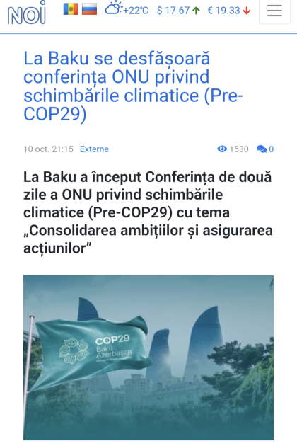 Moldovanın “Noi.md” xəbər portalında Azərbaycanda keçiriləcək BMT-nin İqlim Dəyişmələri üzrə Çərçivə Konvensiyasının Tərəflər Konfransının 29-cu sessiyası (COP29) barədə məqalə dərc edilib.