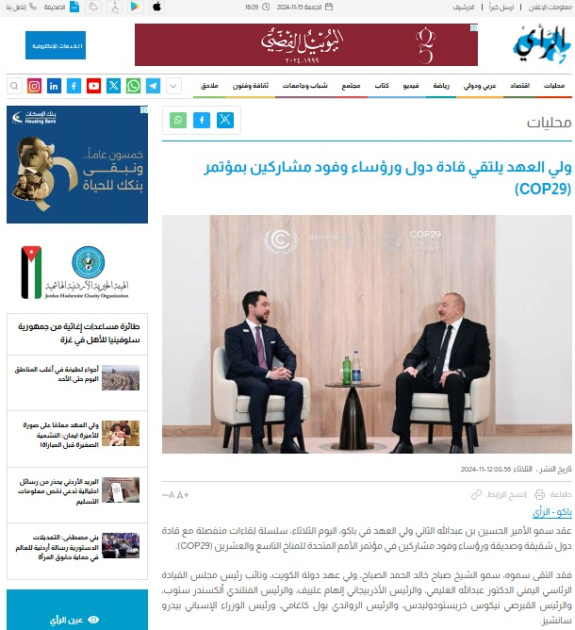 Xəbərlərdə COP29 çərçivəsində keçirilən Liderlər Sammitində İordaniya Kralı II Abdullahı təmsil edən Vəliəhd Şahzadə II Əl-Hüseyn bin Abdullahın tədbirdəki çıxışı, həmçinin Azərbaycan Prezidenti İlham Əliyev ilə görüşü barədə ətraflı məlumat verilib. Bundan əlavə, COP29-un Bakıda yüksək səviyyədə təşkil edilməsi, iqlim dəyişmələrinə dair danışıqların uğurla nəticələnməsi və COP29-la bağlı təşəbbüslərin dəstəklənməsi ilə bağlı müsbət rəylər oxuculara təqdim olunub. Azərbaycanın dünyanın prioritet qəbul etdiyi yaşıl enerji layihələri ilə bağlı məlumat verilib, ölkəmizin bu sahədə təcrübəsinin dünyaya çatdırılması məsələləri geniş işıqlandırılıb.