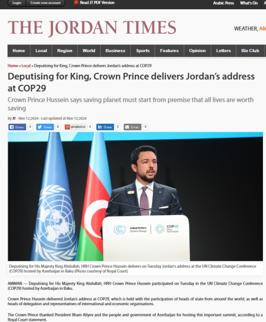 Yerli mediada Vəliəhd Şahzadə II Əl-Hüseyn bin Abdullahın COP29-da iştirakı, Azərbaycanın tarixi və turizm imkanları ilə bağlı faktların yer aldığı videoçarxlar da bu ölkə mətbuatında geniş yayılıb.