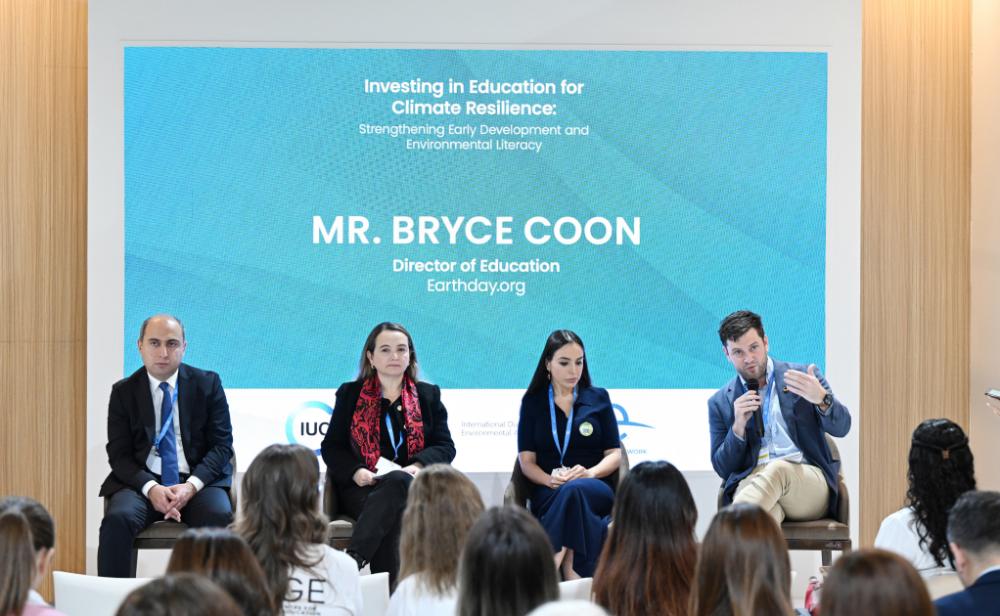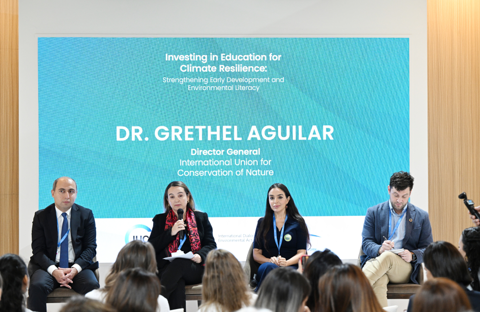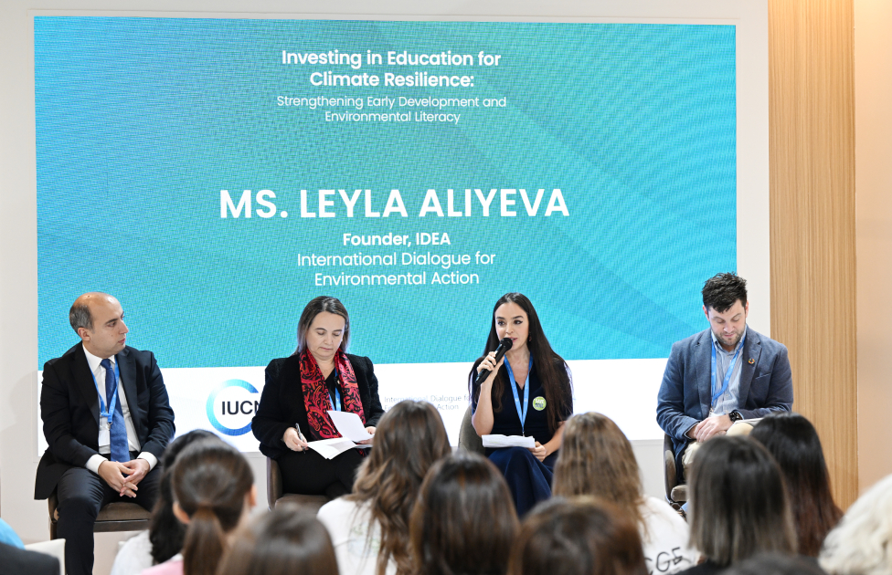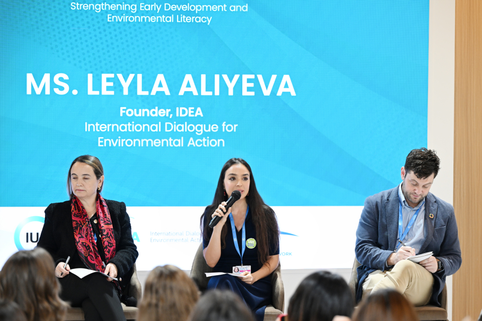 Heydər Əliyev Fondunun vitse-prezidenti, IDEA (Ətraf Mühitin Mühafizəsi Naminə Beynəlxalq Dialoq) İctimai Birliyinin təsisçisi və rəhbəri Leyla Əliyeva Beynəlxalq Təbiəti Mühafizə İttifaqı (BTMİ) və IDEA İB-nin birgə təşkilatçılığı ilə BMT-nin İqlim Dəyişmələri üzrə Çərçivə Konvensiyasının Tərəflər Konfransının 29-cu sessiyası (COP29) çərçivəsində həyata keçirilən “İqlim dayanıqlığı üçün təhsilə investisiya: erkən inkişaf və ətraf mühit savadlılığının artırılması” mövzusunda müzakirələrdə iştirak edib.