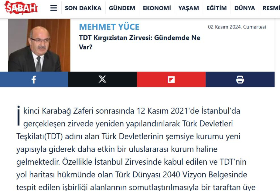 Mehmet Yücenin nəşrində Azərbaycan liderinin Şuşadakı çıxışından sitat gətirilir: “Biz böyük bir coğrafi ərazini əhatə edirik, üzv ölkələrdə müsbət demoqrafik dinamika müşahidə olunur, hərbi potensialımız döyüş meydanlarında özünü dəfələrlə sübut edib. Zəngin təbii sərvətlər, onların çatdırılması üçün müasir infrastruktur, Orta Asiya və Qafqazı Aralıq dənizi və Qara dəniz limanları ilə birləşdirən nəqliyyat dəhlizləri, zəngin və qədim tarix və mədəniyyət bizim ən böyük sərvətimizdir. Xalqlarımızın ənənəvi dəyərlərə və etnik birliyə sadiqliyi ölkələrimizi sıx birləşdirir. XXI əsr Türk dünyasının firavanlıq əsrinə çevrilməlidir”.