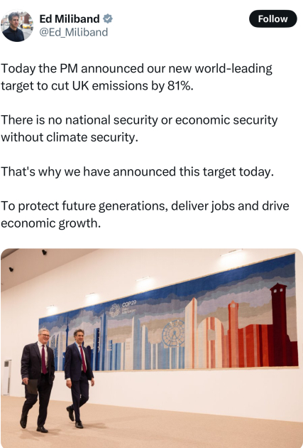 Britaniyanın Baş naziri Kir Starmer, xarici işlər naziri Devid Lemmi və enerji təhlükəsizliyi və sıfır emissiya naziri Ed Milibend BMT-nin İqlim Dəyişmələri üzrə Çərçivə Konvensiyasının Tərəflər Konfransının 29-cu sessiyasında (COP29) iştirak edirlər.