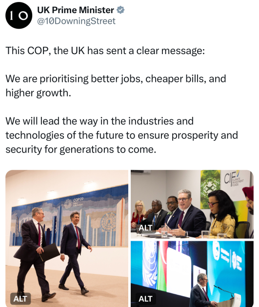 Baş nazir Kir Starmer keçirdiyi ikitərəfli görüşlər və çıxışlarından video yayımlayıb. Paylaşımında o, Britaniyanın gələcək nəsillər üçün təhlükəsizlik və sabitliyi təmin etməyə sadiq olduğunu vurğulayıb. Baş nazirin digər paylaşımında iqlim tədbirlərinin investisiya, yeni iş yerləri və gələcəyin texnologiyasını inkişaf etdirmək üçün bir fürsət olduğu qeyd edilib.