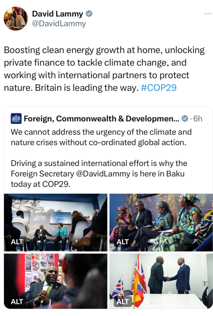 Xarici işlər naziri Devid Lemmi COP29-la bağlı paylaşımında Britaniyanın təmiz enerjinin inkişafını sürətləndirmək, iqlim dəyişikliyinə qarşı mübarizədə özəl sektordan maliyyə vəsaitlərinin cəlb edilməsi və təbiəti qorumaq üçün beynəlxalq tərəfdaşlarla əməkdaşlıqda liderlik etdiyini vurğulayıb.