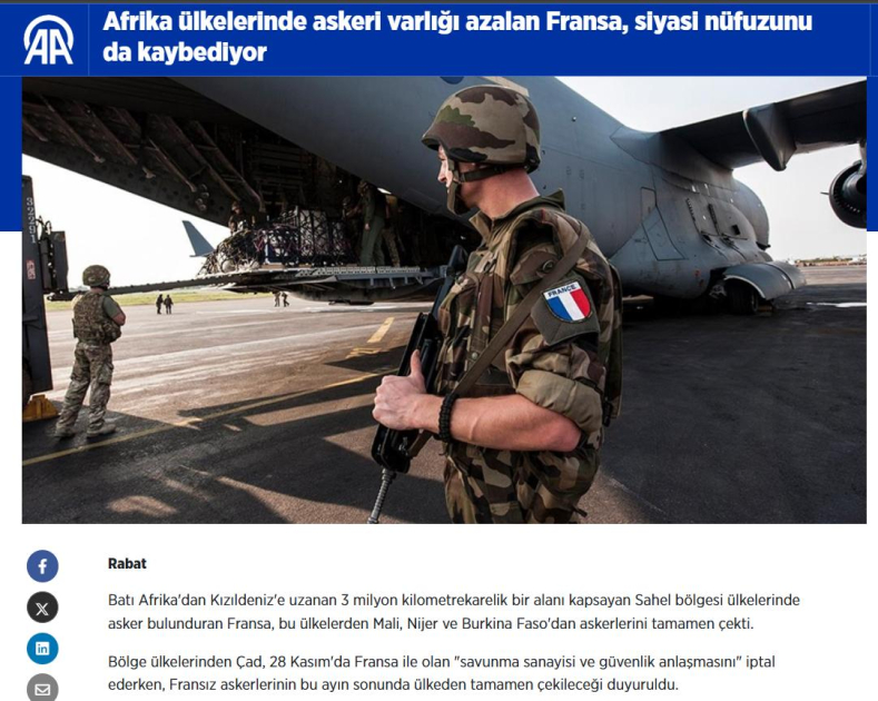 “Anadolu” agentliyi oxucuların diqqətini Fransa hərbi kontingentinin Mali, Niger və Burkina-Fasodan tamamilə çıxarılmasına, habelə Çad hakimiyyətinin ötən il noyabrın 28-də Parislə təhlükəsizlik və müdafiə sənayesi sahəsində müqaviləni ləğv etmək qərarına yönəldib.