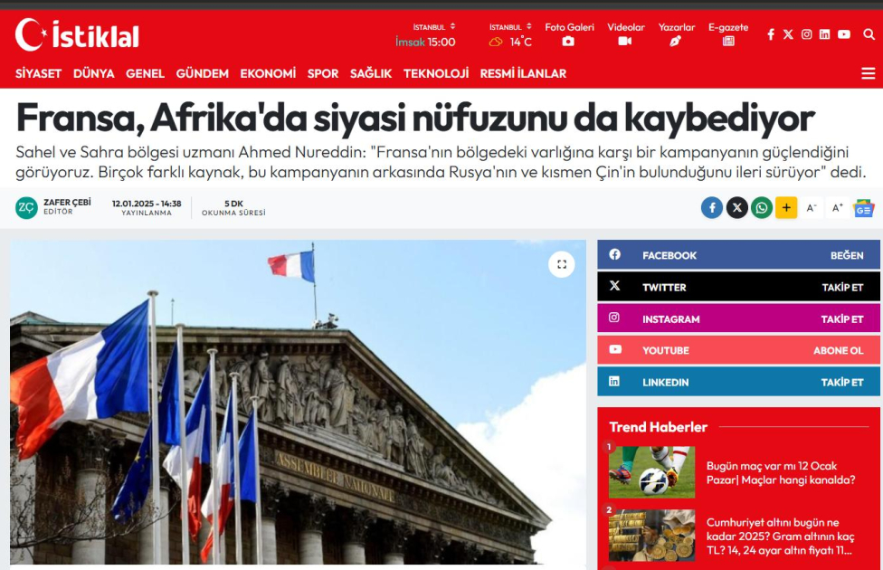 AZƏRTAC xəbər verir ki, bu barədə Türkiyə mediasının Paris ilə Afrika ölkələri arasında münasibətlərdəki böhrana həsr olunmuş reportajlarında və analitik məqalələrində deyilir.