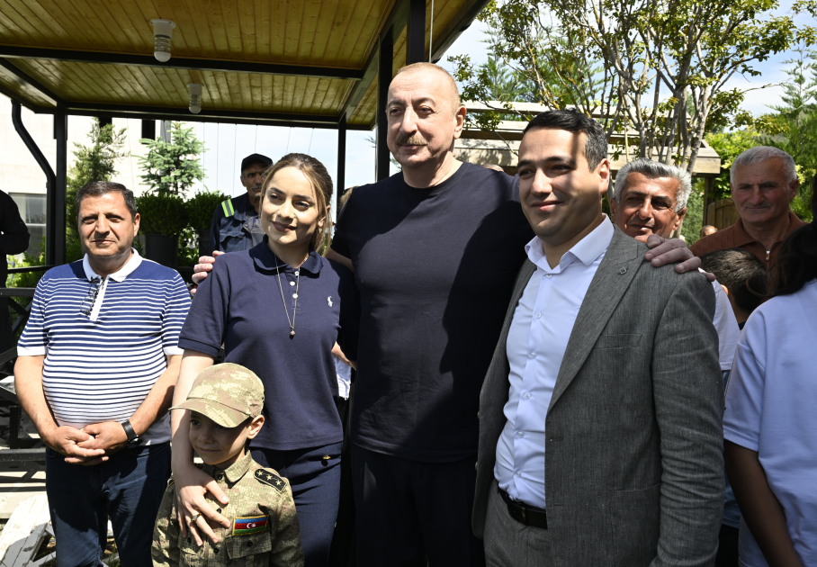 Prezident İlham Əliyev: Gəlin, belə duraq. Burada harada dursan yenə də cənnət görünür. Balacanı da mən götürüm qucağıma. Balaca, gəl buraya.