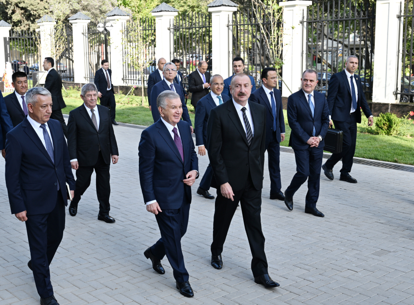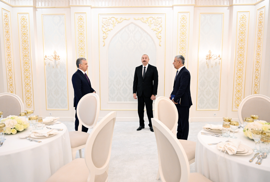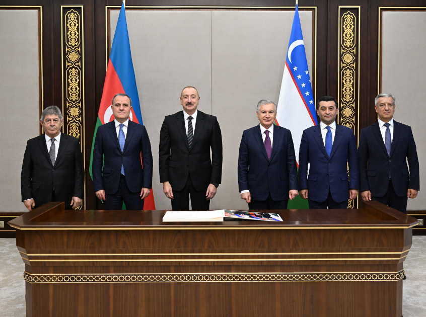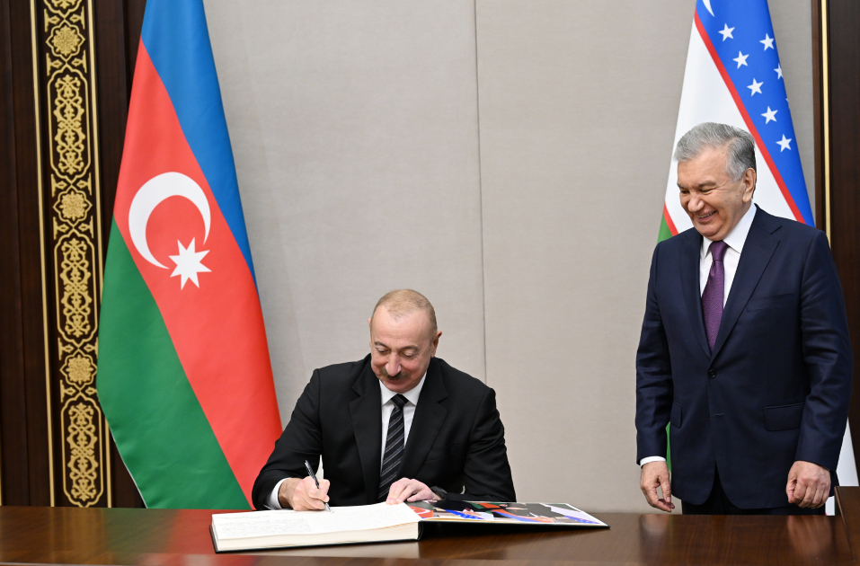 Bina ilə tanışlıqdan sonra Prezidentlər İlham Əliyev və Şavkat Mirziyoyev səfirliyin Fəxri qonaqlar kitabına ürək sözlərini yazdılar.