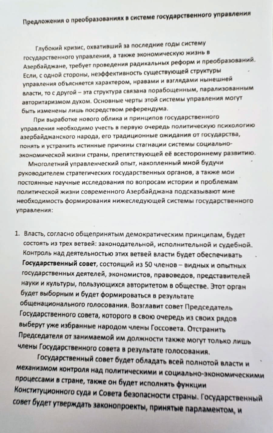 Mənim uzunillik idarəetmə təcrübəm, strateji dövlət orqanlarına rəhbərlik etdiyim dövrlərdə topladığım biliklər, həmçinin müasir Azərbaycanın siyasi həyatına və tarixə dair elmi tədqiqatlarım mənə aşağıdakı dövlət idarəetmə sisteminin formalaşdırılmasının zəruriliyini göstərir: