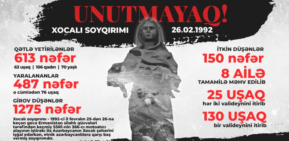Xalqımız ermənilərin havadarlarının dəstəyi ilə törətdikləri daha bir faciənin acısını 1992-ci il fevralın 25-dən 26-na keçən gecədə yaşayıb. Xocalı faciəsi ermənilərin qəddarlığını bütün cəhətləri ilə açıb ortaya qoyur.