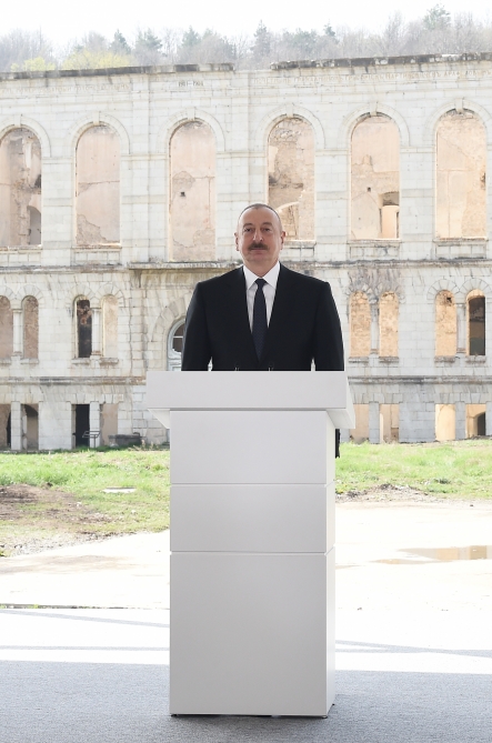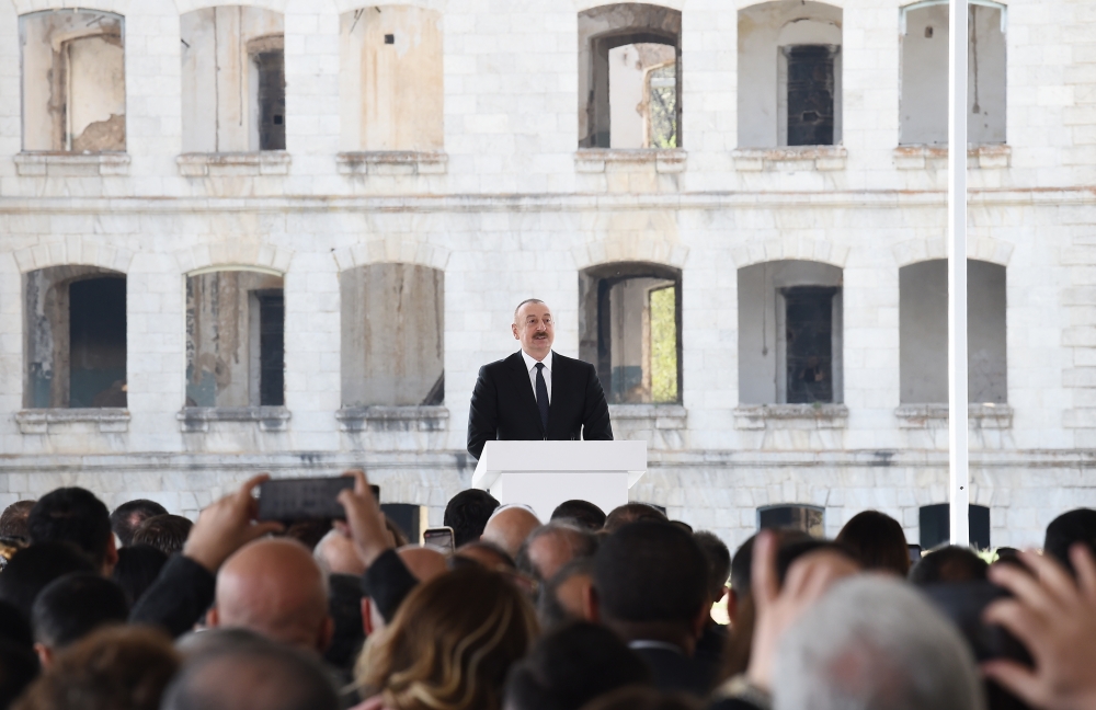 Если бы этот город принадлежал армянам, разве они привели бы его в такое состояние? Здесь проживали всего 1800 человек. Причем 90 процентов их были военнослужащие и члены их семей. Здесь не осталось ни одного целого исторического здания. Армяне осушили все 17 родников, осквернили, снесли наши мечети, разрушили дворцы. То есть, здесь не было построено ни одного нового здания. Они просто эксплуатировали наши природные ресурсы. И не только Шуша, но и все остальные города находятся в таком же состоянии. Иностранные эксперты, журналисты уподобляют полностью разрушенный Агдам Хиросиме. Да, Хиросима была уничтожена в результате атомной бомбардировки. Агдам и другие города уничтожены в результате армянского вандализма. После прекращения Первой Карабахской войны они в течение тридцати лет по камням разбирали здания, увозили, продавали. Это есть в отчетах международных организаций. Они вскрывали могилы, вырывали золотые коронки у покойников. То есть, Армения и армянский народ опозорились в мире из-за этих зверств. Поэтому каждый гость, приезжающий на освобожденные земли, видит и должен видеть армянский вандализм. Должен видеть, что мы уничтожили не только оккупантов, но и фашистов. Все их деяния в Первой Карабахской войне, во Второй Карабахской войне, в период между двумя войнами – фашистские. Если обстрел во время войны баллистическими ракетами наших мирных городов, уничтожение людей не фашизм, то что это? Шуша подверглась обстрелу ракетами «Точка-У», «СКАД», «Искандер-М». После того, как сошел снег, в Шуше, в центре города были обнаружены фрагменты ракеты «Искандер-М», и мы еще раз доказали, что Армения использовала это смертоносное, запрещенное оружие, которого у них никогда не было. Те, кто не верит, могут пойти и увидеть фрагменты ракеты «Искандер-М» в Парке военных трофеев.