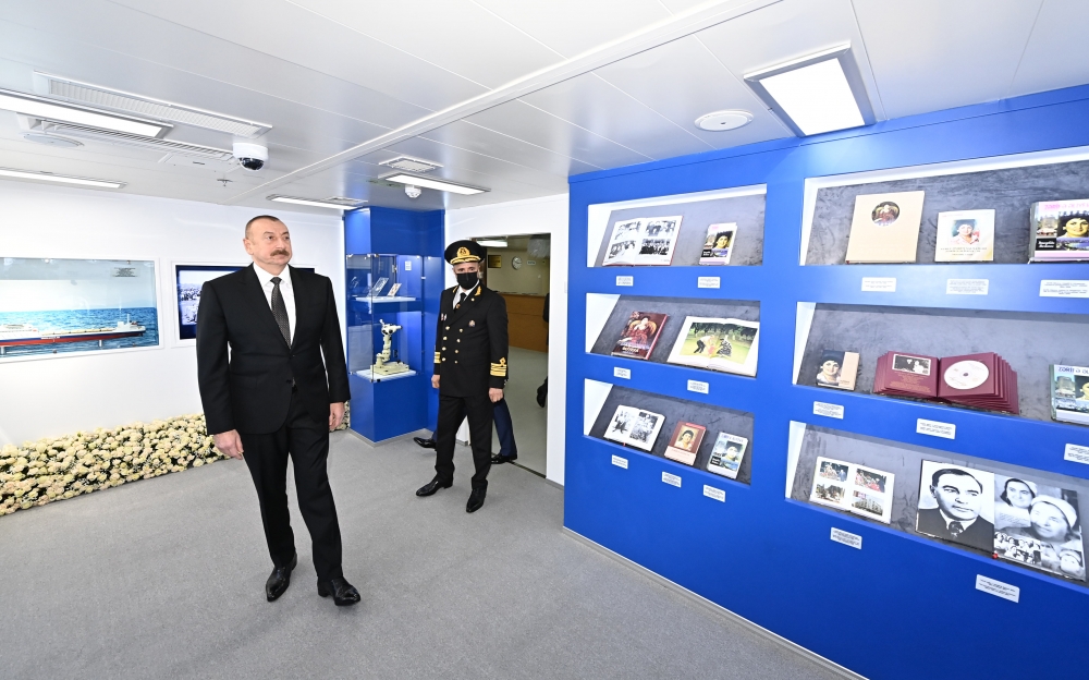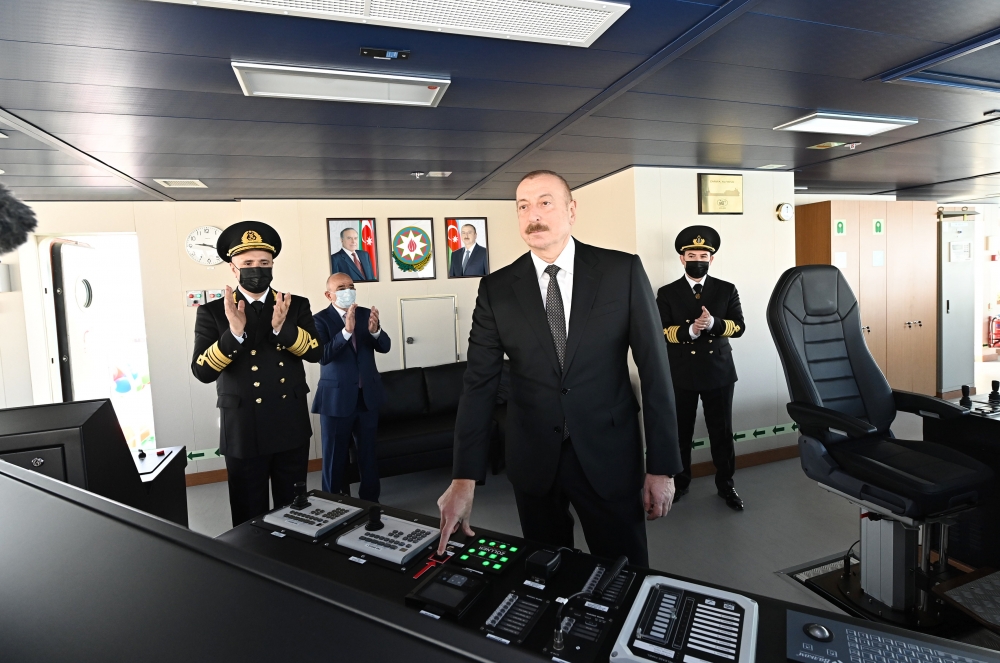 После ознакомления с судном-паромом Президент Ильхам Алиев нажал кнопку, означающую ввод его в эксплуатацию.