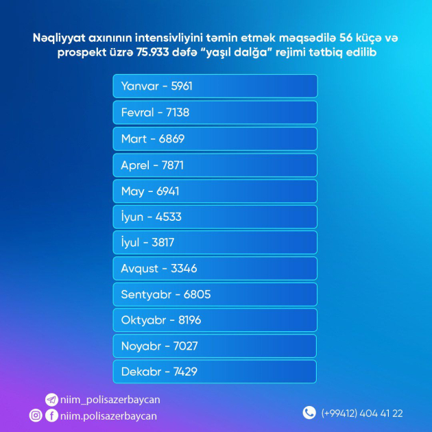 Ötən il ərzində 2 min 244 texniki nasaz nəqliyyat vasitəsinin yollarda qalması digər nəqliyyat vasitələrinin sərbəst və fasiləsiz hərəkətinə mane olub. Nəqliyyatı İntellektual İdarəetmə Mərkəzi tərəfindən sıxlıqların vaxtında qarşısının alınması və yollarda nəqliyyat axınının intensivliyini təmin etmək məqsədilə 56 küçə və prospekt üzrə 75 min 933 dəfə yaşıl dalğa rejimi tətbiq edilib.