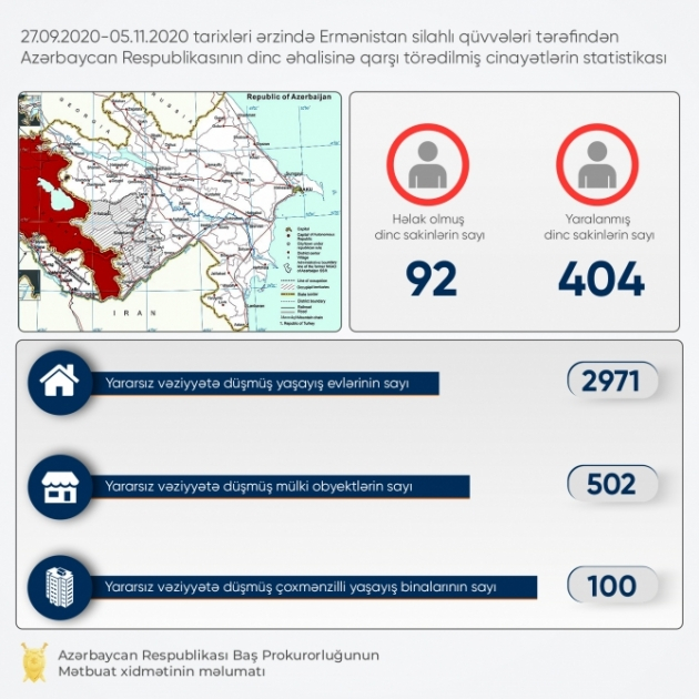 • Düşmənin dinc əhaliyə qarşı təxribatları nəticəsində sentyabrın 27-dən noyabrın 5-dək 92 mülki şəxs həlak olub, 404 nəfər xəsarət alıb, 2 min 971 ev, 100 çoxmənzilli yaşayış binası və 502 mülki obyekt yararsız vəziyyətə düşüb. Bu barədə Baş Prokurorluq məlumat yayıb.