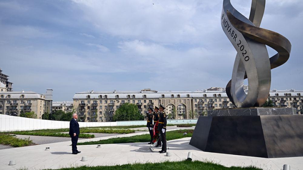 Zəfər parkına gələn Türkiyənin milli müdafiə naziri Zəfər abidəsinin önünə əklil qoyub.