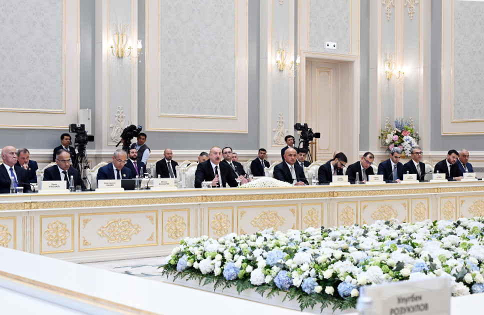 Əvvəlcə bu görüşün keçirilməsi təşəbbüsünə görə Özbəkistan Prezidentinə təşəkkür etmək istərdim. Qeyd edim ki, mənim praktikamda belə görüşlər heç vaxt olmayıb. Rəsmi səfərlər çərçivəsində biznes forumlarında iştirak etdiyim, yaxud xarici dövlət başçılarının səfərləri zamanı Bakıda biznes forumlarının keçirildiyi hallar olub, amma bir qayda olaraq onlar dövlət başçılarının hansısa qısa nitqlərlə müraciət etmələri ilə məhdudlaşıb, sonra çıxıb gediblər, biznes-forum isə öz axarı ilə davam edib. Prinsipcə, bu günlərdə Daşkənddə keçirilən biznes-forum layihələrlə çox zəngin olub. Amma nisbətən məhdud tərkibdə iki ölkənin işgüzar dairələrinin əsas nümayəndələrinin belə bir görüşü mənim praktikamda ilk dəfədir keçirilir. Ona görə də bundan başlamaq və Şavkat Miromonoviçə təşəkkürümü bildirmək istəyirəm.