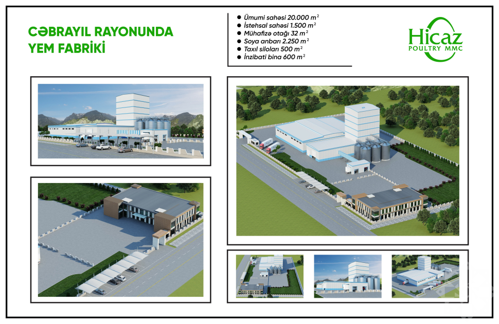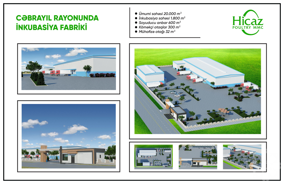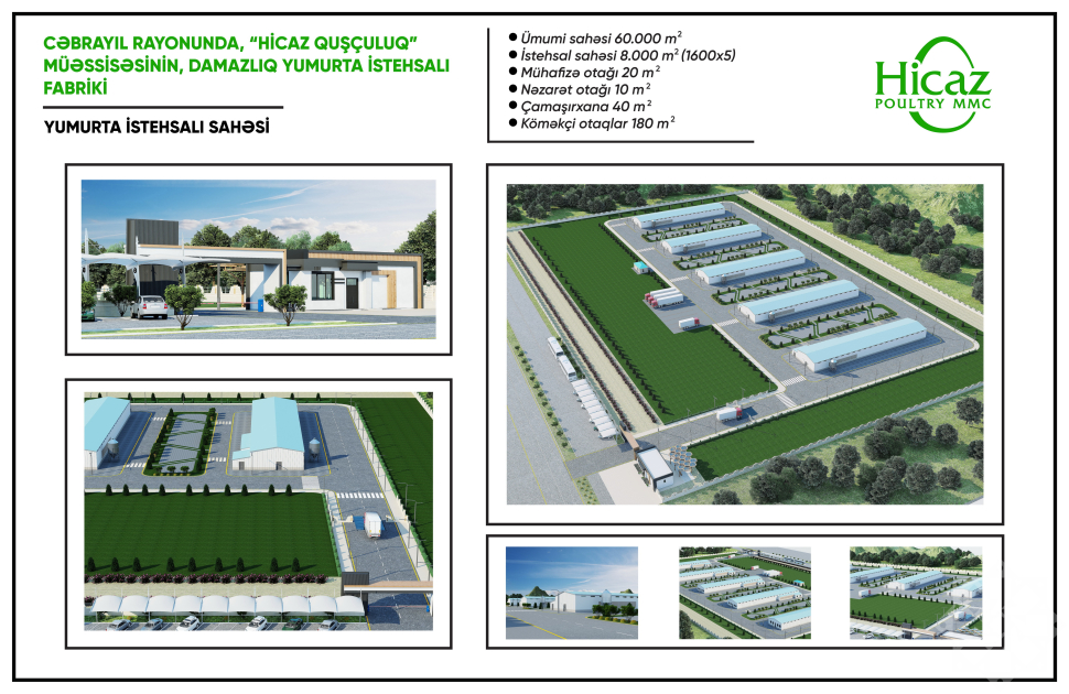 Prezident İlham Əliyev tərəfindən Cəbrayıl rayonunda təməli qoyulan “Hicaz quşçuluq” müəssisəsinin damazlıq yumurta istehsalı fabrikində ilkin mərhələ üzrə 24 damazlıq yumurta istehsalı sahəsi tikiləcək.