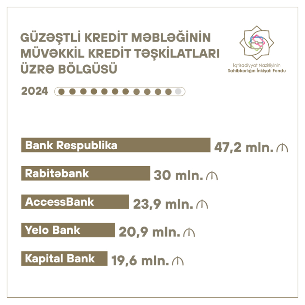 Həmin dövrdə verilmiş güzəştli kreditlərin məbləği üzrə fərqlənən müvəkkil kredit təşkilatlarına isə “Bank Respublika” ASC, “Rabitəbank” ASC, “AccessBank” QSC, “Yelo Bank” ASC və “Kapital Bank” ASC daxildir.