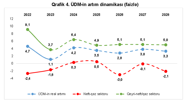 İqtisadiyyatın şaxələndirilməsi ilə bağlı yürüdülən siyasət öz müsbət təsirlərini göstərməkdədir və artıq ölkənin inkişafında ağırlıq mərkəzi tamamilə qeyri-neft sektorunun üzərinə transformasiya olunmaqdadır. Yaxınmüddətli iqtisadi inkişaf ssenarilərinə əsasən, neft-qaz sektorunun tədricən daralacağı şəraitində iqtisadi artımın əsas hərəkətverici qüvvəsi qeyri-neft gəlirləri olacaq və 2024-cü ildə ÜDM-in tərkibində qeyri-neft sektorunun payının 72 faizə çatacağı proqnozlaşdırılır. Eyni zamanda, qeyri-neft resurslarının yüksək artımları müqabilində ilin sonunda ümumi daxili məhsulun 5-6 faiz təşkil edəcəyi fərz olunur.