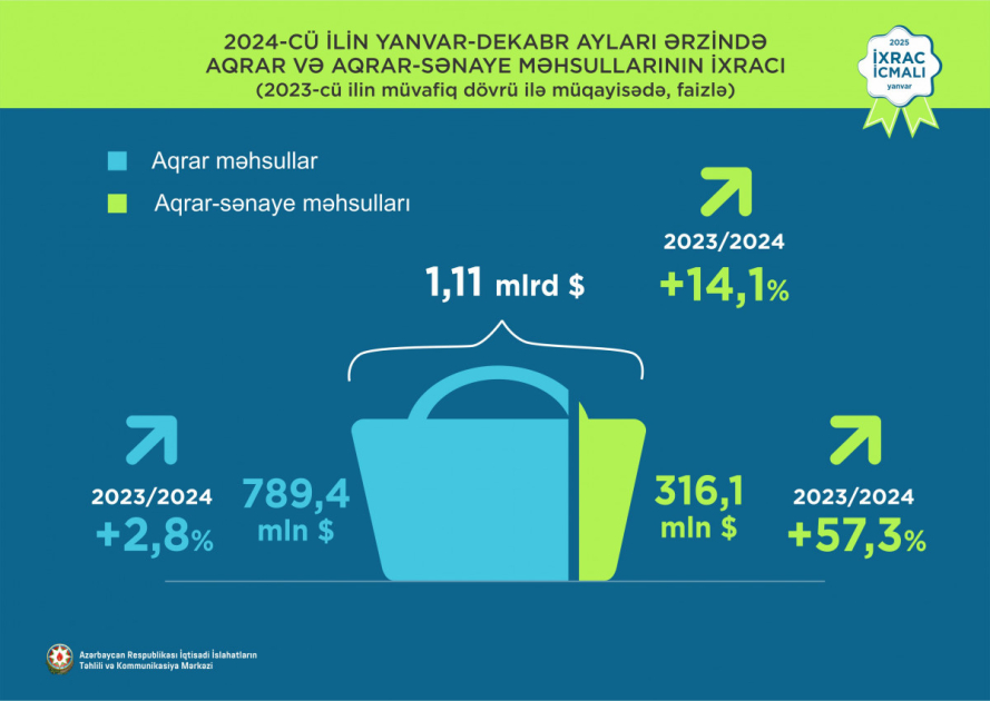 Hesabat dövrü ərzində aqrar məhsulların ixracı 2,8 faiz artaraq 789,4 milyon dollar, aqrar-sənaye məhsullarının ixracı 57,3 faiz artaraq 316,1 milyon dollara bərabər olub. Bütövlükdə aqrar və aqrar-sənaye məhsullarının birgə ixracı 14,1 faiz artaraq 1,11 milyard dollar təşkil edib.
