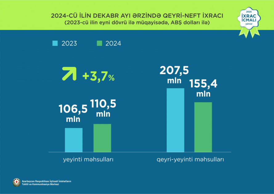 2024-cü ilin yanvar-dekabr ayları ərzində Azərbaycanın qeyri-neft-qaz ixracı 2023-cü ilin müvafiq dövrü ilə müqayisədə 0,3 faiz artaraq 3,4 milyard dollar təşkil edib.